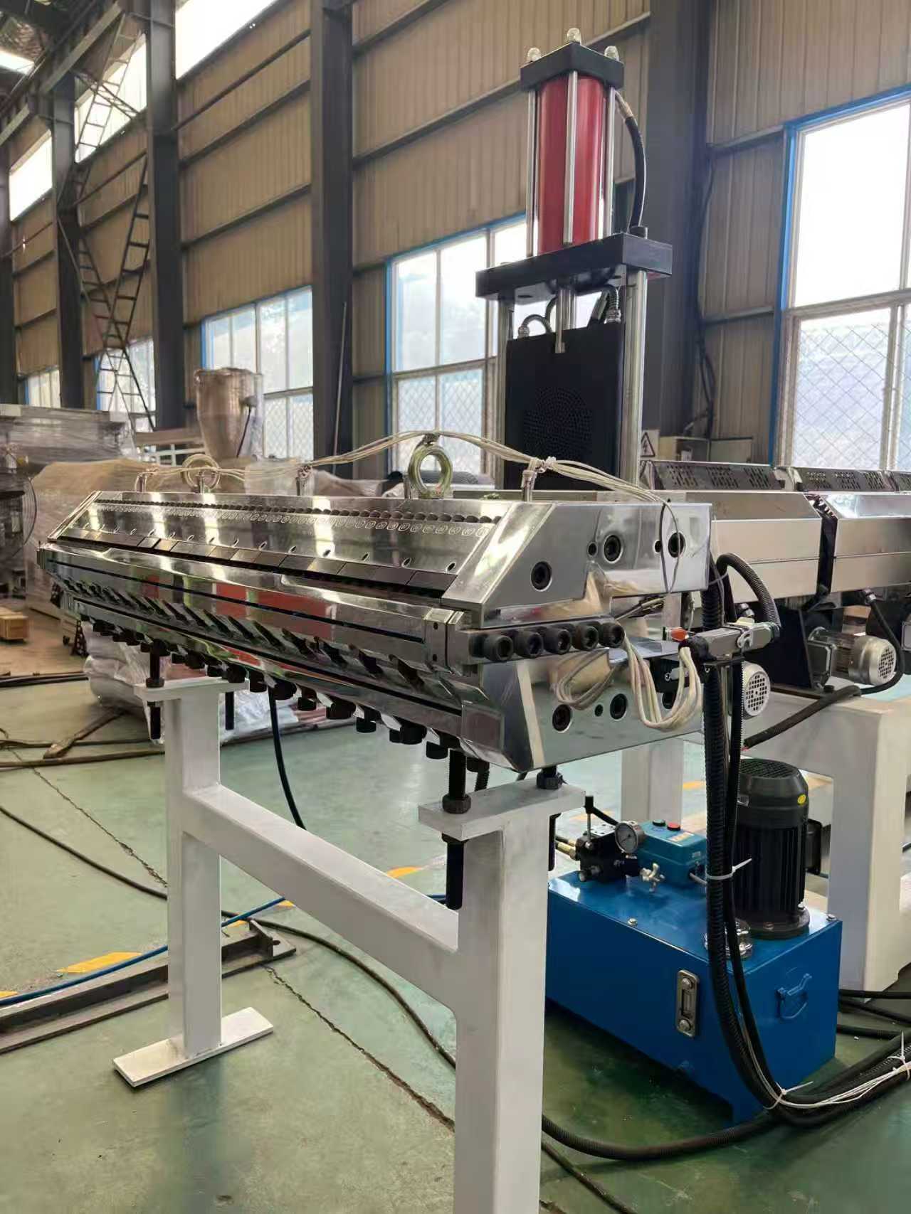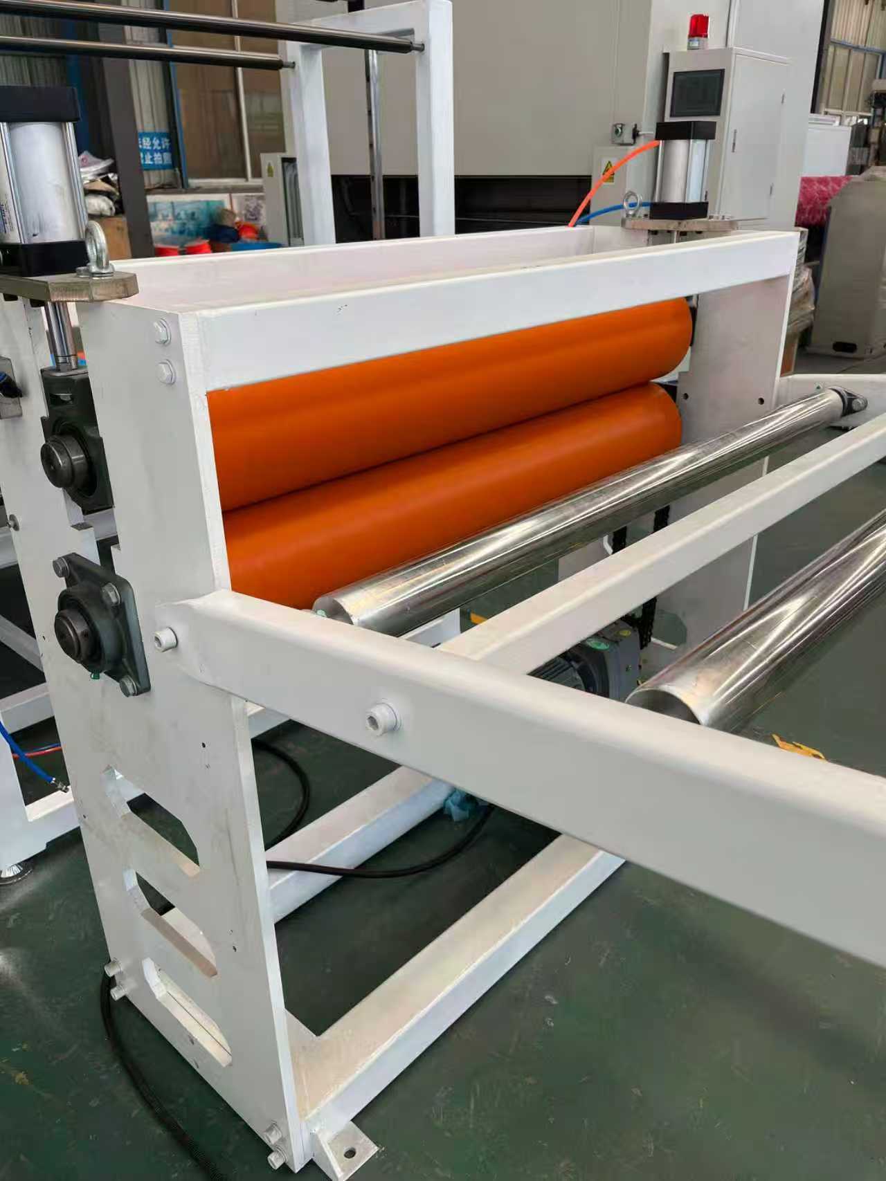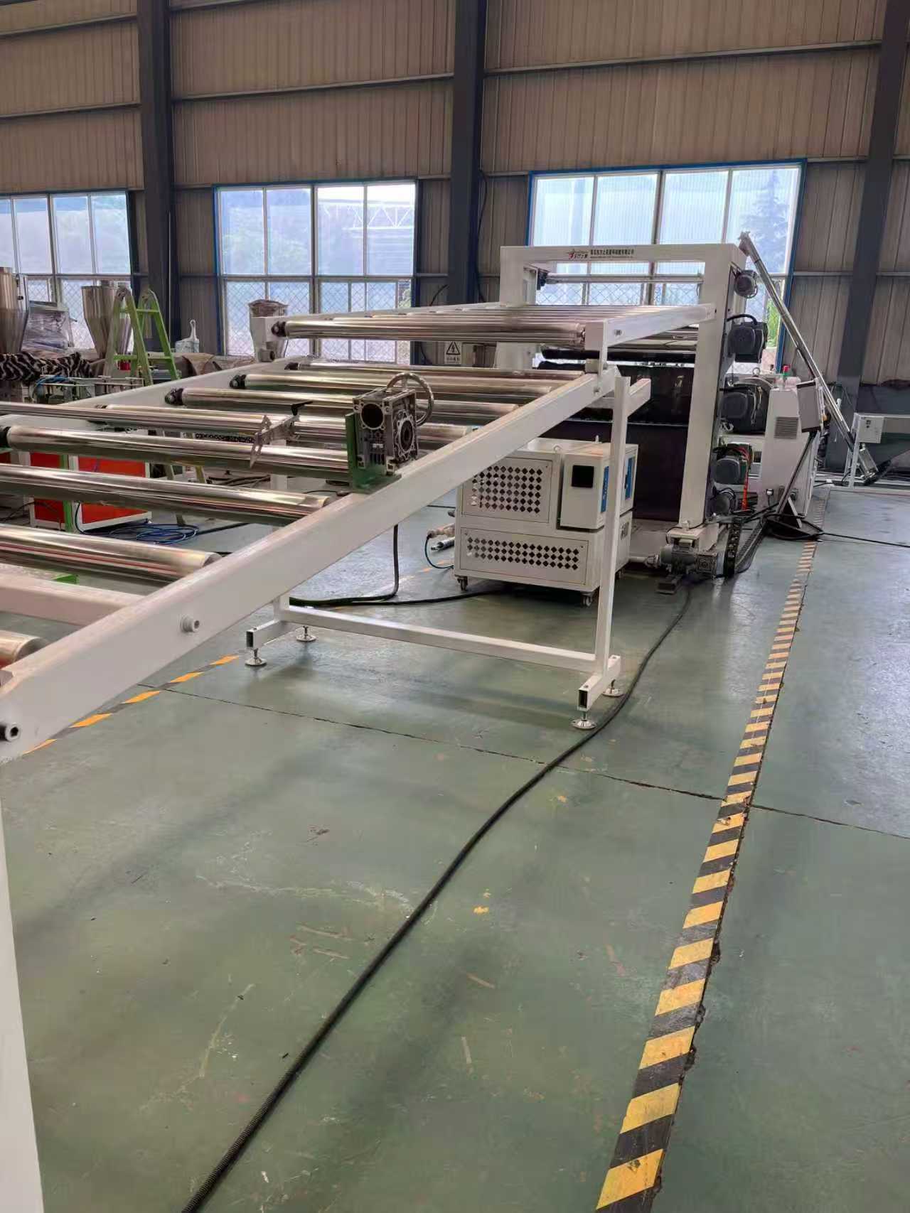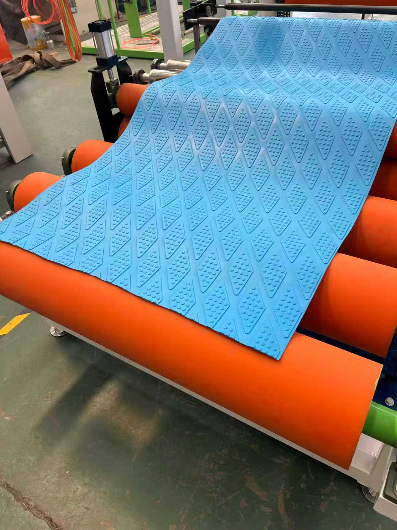 TPE-1000 mm antislipmatuitrusting autovloermatten: de uitrusting bestaat voornamelijk uit een extruder met enkele schroef, een kalender met drie rollen, een koelbeugel van 6 meter, een tractiemachine met rubberen rollen, een knipmachine en een transportband apparaat.